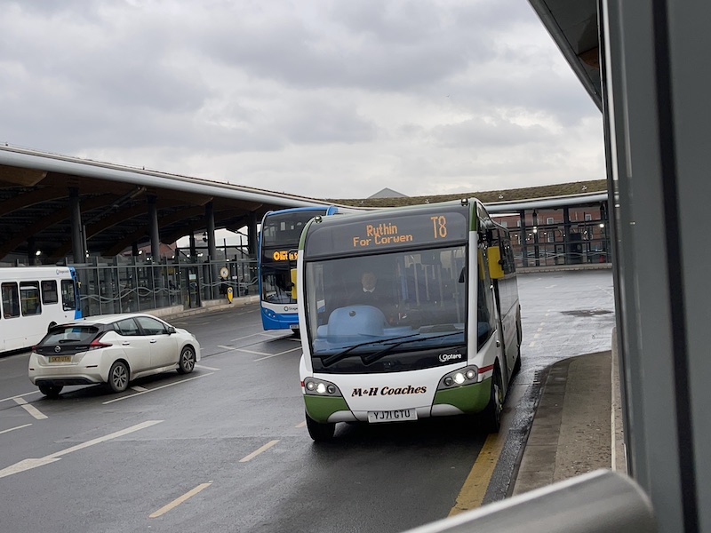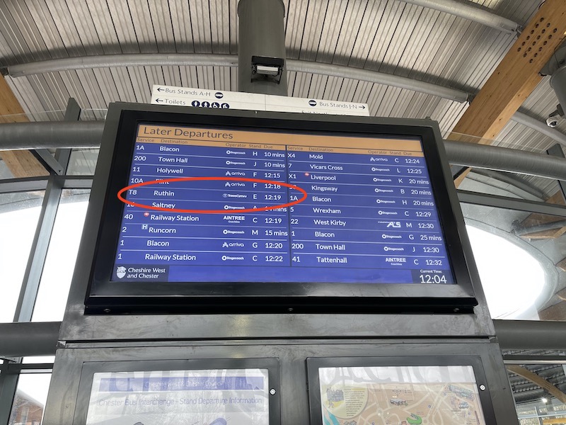 … and printed departure lists at the stand showed the T8 they all referred to the destination as Ruthin rather than Corwen because of the now outdated EU requirement to split bus registrations into 30 mile or less segments. It really is time this practice stopped and we actually had one benefit of Brexit chalked up, doing away with that misplaced rule. It even had me worried that I’d misread all the information beforehand and the bus didn’t go to Corwen so I’m sure less informed passengers are confused.
