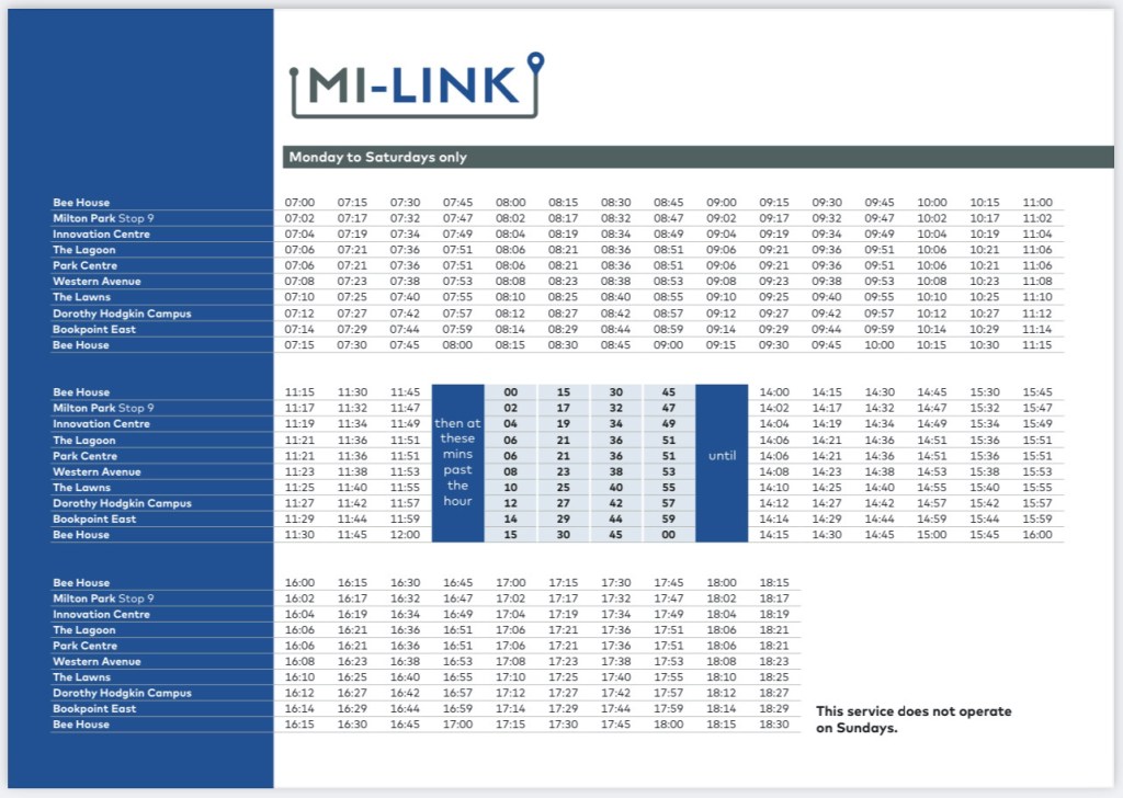 Operated by First Bus on a 15 minute headway it takes just under a quarter of an hour to complete its circular loop around the swish business park in Didcot known as Milton Park operating for almost 12 hours from 07:00 to 18:30 Mondays to Saturdays using a zero emission Mellor Orion E minibus.