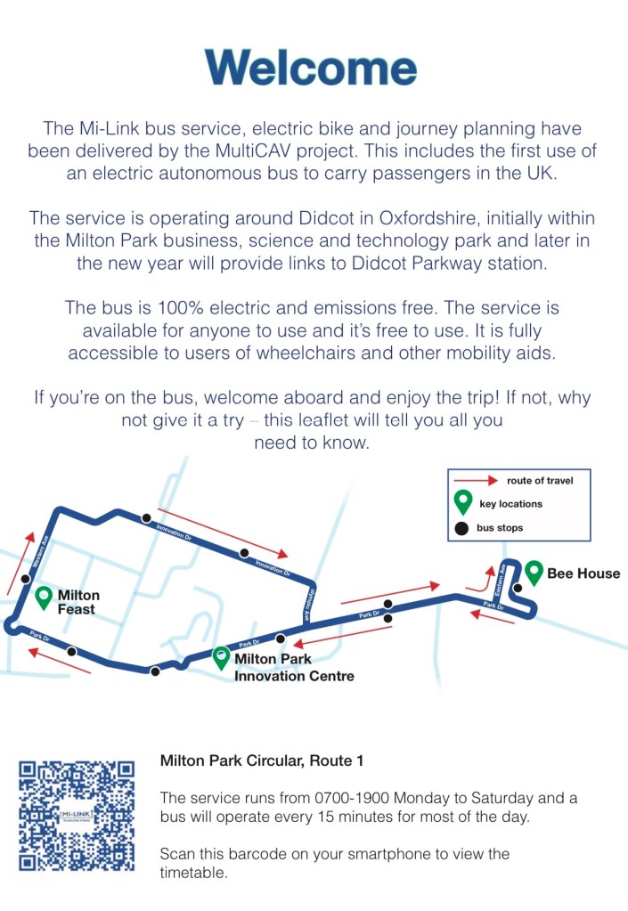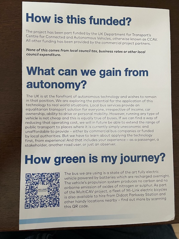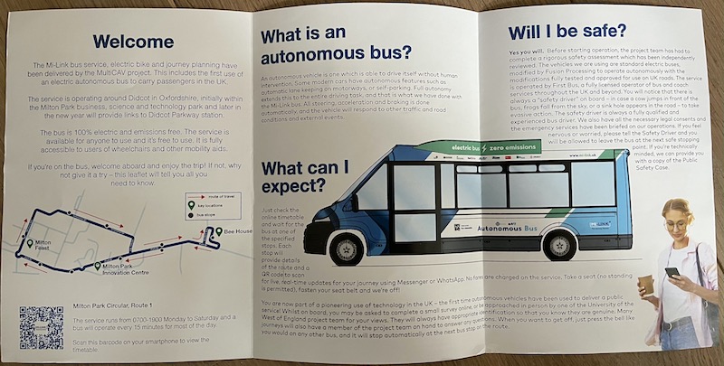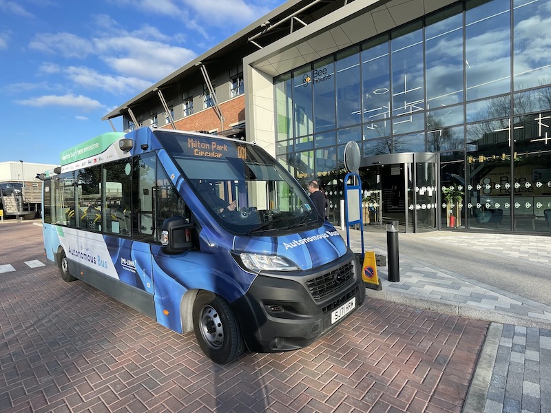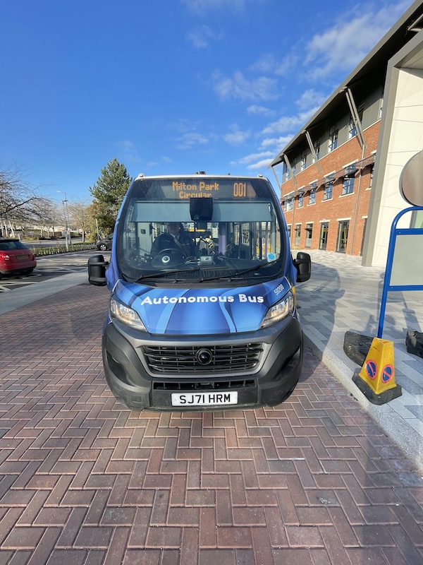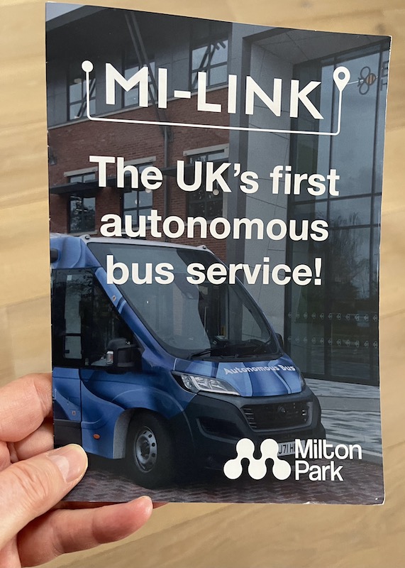 This should really challenge the software as the roads are proper public roads which are much busier, particularly trying to exit the bus stop area immediately outside the station. The driver of the bus on route X2 I took to reach Milton Park had to wait quite some time for a break in the traffic to exit and then only because a passing taxi gave way. I can imagine an autonomous bus might sit there for ages. Unless the driver intervenes – but doesn’t that rather ruin the idea of it being autonomous and ultra safe?