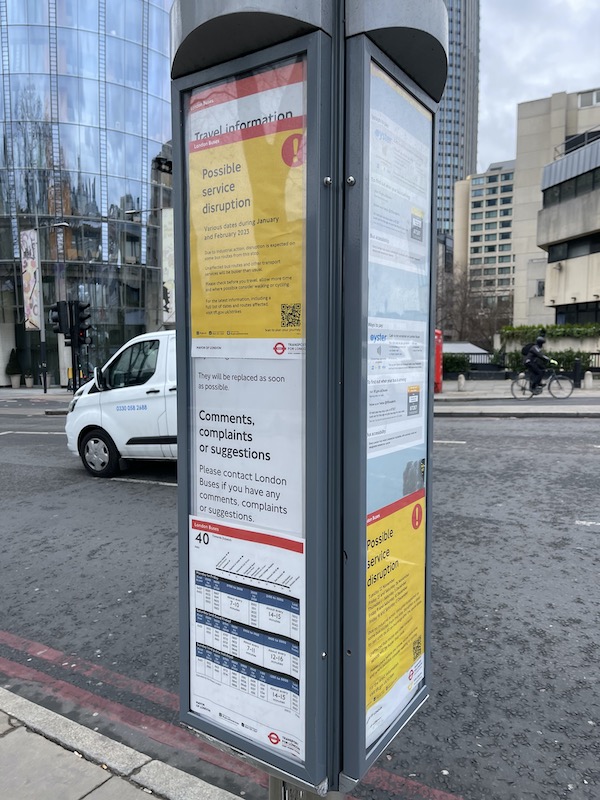 Flicking through the panels at the 63 bus stop closest to TfL HQ last month, one screen contained out-of-date strike information.