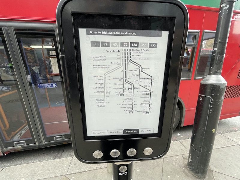 …. TfL standard style timetables for each route using the stop (this one at Elephant & Castle had 11 pages to cycle through for each of the 11 routes that stop there….