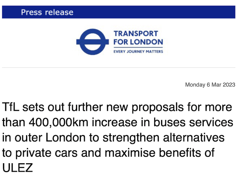 TfL’s Press Office was busy yesterday proclaiming“further new proposals for more than 400,000km increase in buses services in outer London to strengthen alternatives to private cars and maximise benefits of ULEZ”. And if you think the grammar doesn’t quite sound right in that sentence, don’t blame my usual sloppy fat finger error prone typing, that’s how the headline ran on the Press Release.
