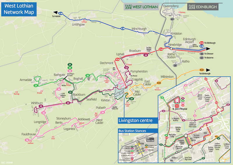 On the former First Scotland East network, McGills’ Eastern Scottish runs a half hourly X22 Edinburgh to Livingston (yellow on the map below) and a half hourly X24 Edinburgh via Newbridge to Livingston (red) as well as other routes providing connections between Livingston, Bathgate and Armadale including route 25 (green).