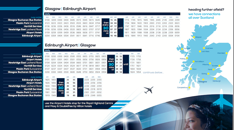 Whereas it’s longer established route branded as AIR runs half hourly taking an hour for the journey (see above), new hourly route 902 introduced in March takes an hour and 40 minutes going via Bargeddie, Coatbridge, Airdrie and Livingston (see below).