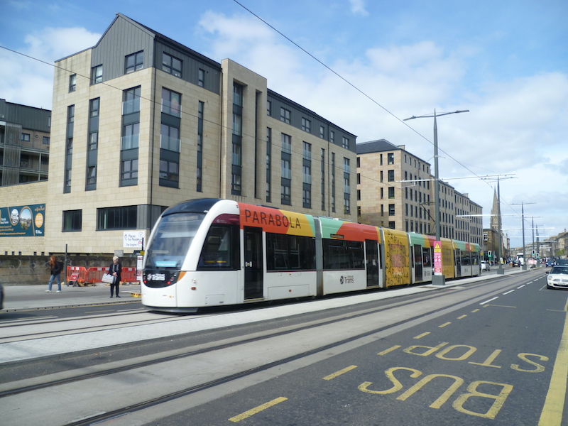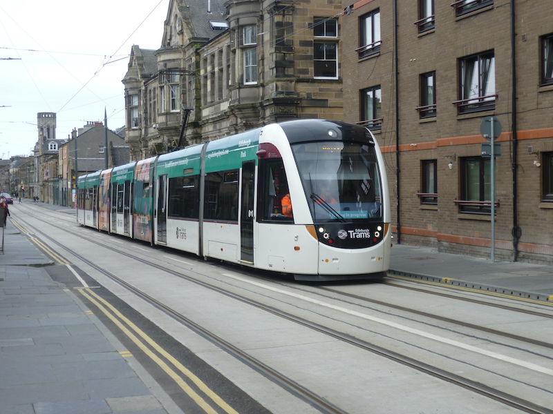 Along Leith Walk is Shrubhill and Roy explains his photo below shows “a Newhaven bound tram at Shrubhill on Leith Walk (between the new tram stops at McDonald Road and Balfour Street). The modern flats on the left are built on the site of the historic former Shrubhill tram works and sometime depot (1871 -2000 approx). In the distance is Pilrig Church on the one time boundary between Edinburgh and Leith (1833-1920). Pilrig was the location of the ‘Pilrig Muddle’ where the different traction systems and operators caused chaos for passengers.”