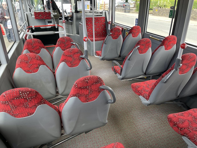 The bus interiors have a smart red moquette and comfortable seats.