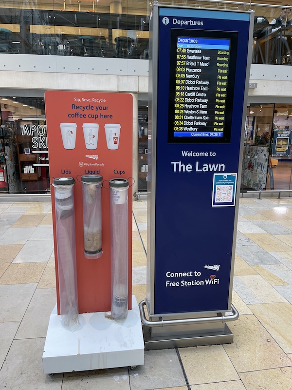 … whereas many smaller stations with just one platform have more bins …. but there are receptacles for coffee cups around Paddington’s concourse which are probably the commonest item of litter these days.