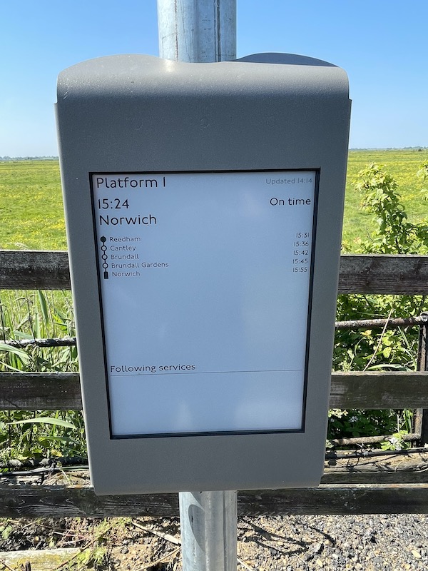 The smaller platform station sign by the help point has been updated to delete reference to Norfolk County Council and insert the Broads Authority.