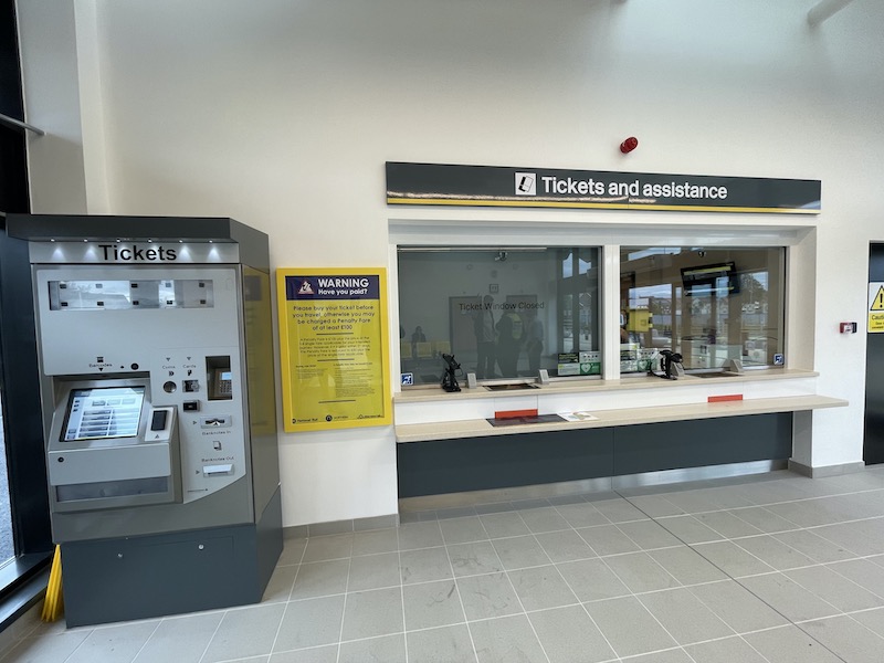 The station building is a basic affair with a two window ticket office (Merseyrail has no plans to close its offices) and a Ticket Vending Machine …