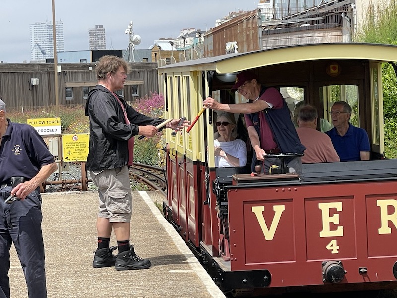 The service runs every 15 minutes with two trains passing at Halfway and where drivers hand over the tokens for authorisation to proceed on the next section of track.