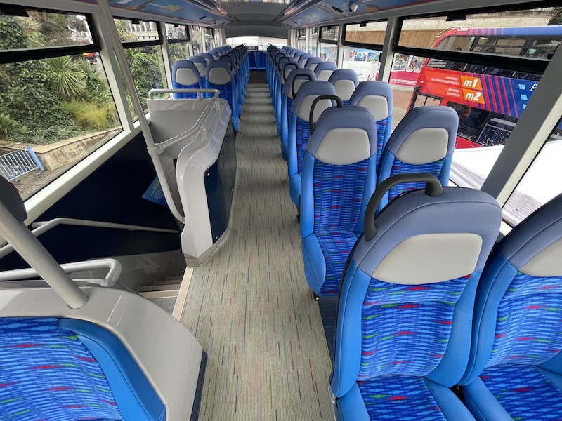 Leg room around the bus on both decks is good; even the front offside seats on the upper deck – notorious for being stingy on foot room could easily accommodate a pair of size ten boots.
