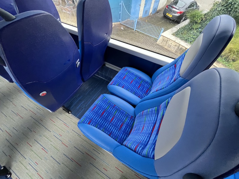 They’re the most comfortable seat I’ve ever sat in on a bus with what feels like a deep cushion which is covered in comfortable cloth and a leather style headrest.
