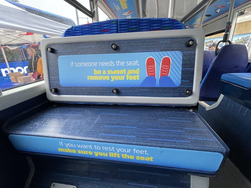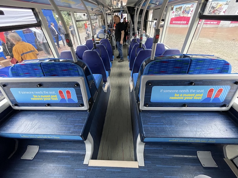 A great idea first trialled by Martijn Gilbert when at sister Go-Ahead company Go North East is the option of turning the rear facing pair of seats over the rear wheel arches into an official footrest explained by nicely worded notices.