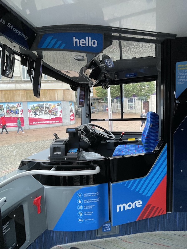 The first thing you notice on boarding is the nice welcoming aura very much helped by the removal of the protective screen on the driver’s cab door – back to pre-pandemic days – and a nice ‘hello’ poster.