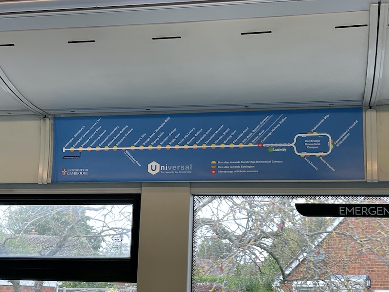 I was in Cambridge on Tuesday so gave these new buses a try out. Traffic had been its usual congested self earlier in the morning and by 11:30 reliability on Universal was still suffering with half hour gaps between buses. Eventually a bus arrived and about a dozen passengers boarded to travel along the Busway to Addenbrooke’s Hospital.