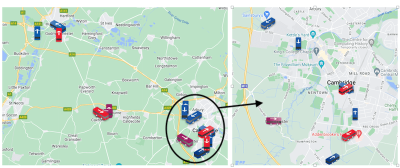 The southern end of the route from the station takes advantage of the Busway heading towards Addenbrooke’s but not on the return since the Busway’s enforced northbound closure last year following safety concerns. This causes delays to buses from the Hospital into the city centre in the busy morning peak.