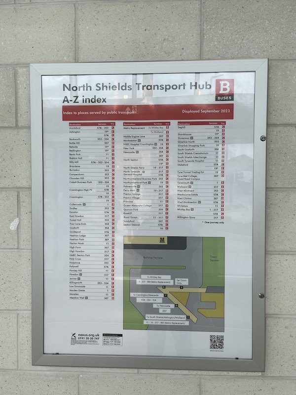 There’s an A-Z Index poster displayed by the entrance which advises the bay buses depart for each destination and confirms Bay A is for set down only. It’s an ideal spot along that corridor (see early photo) to also display printed timetables for all the routes.
