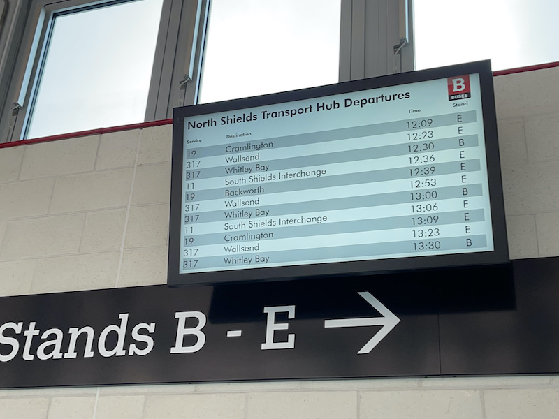 Back to the Transport Hub and bus departures are displayed on screens above each departure bay with a full listing of upcoming departures on a few other screens dotted around.