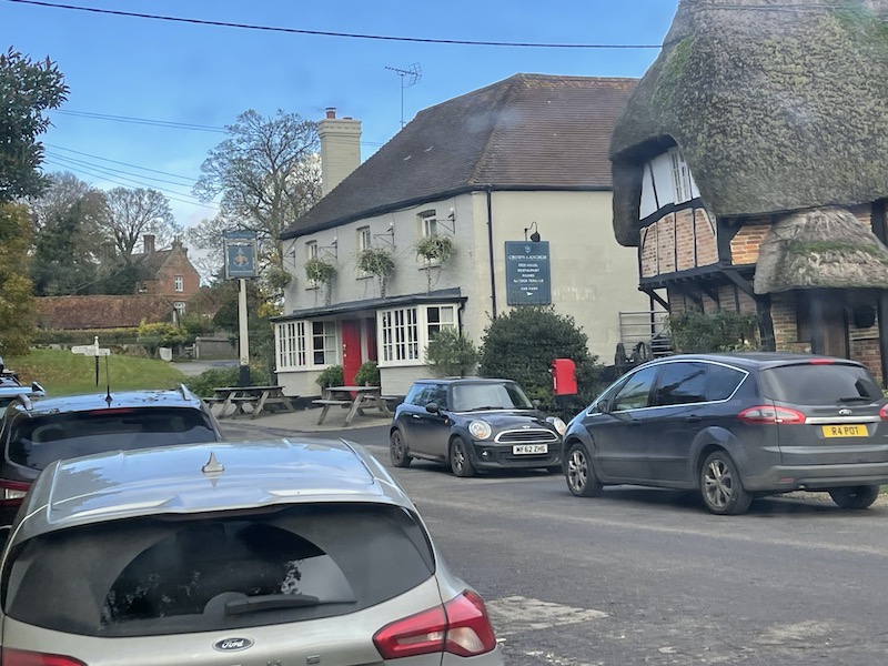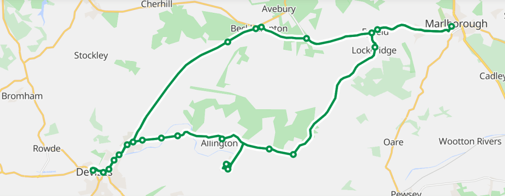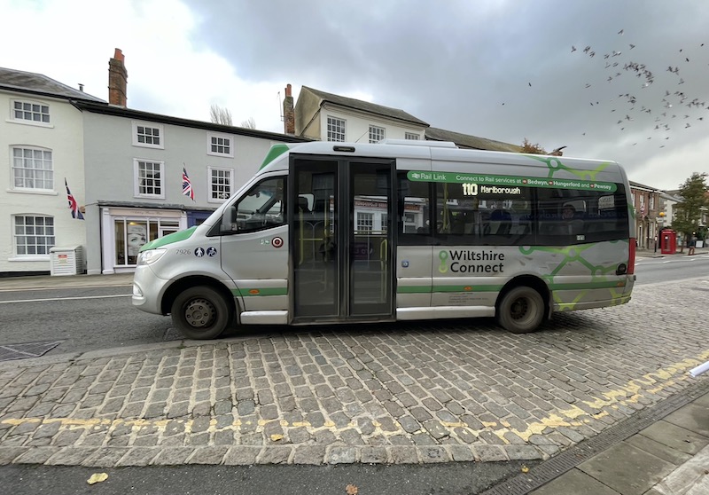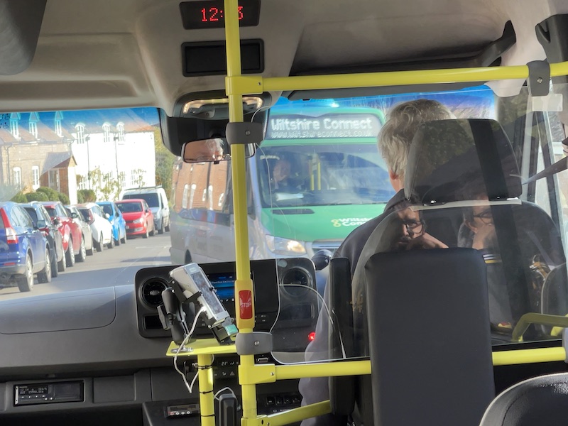 In Great Bedwyn we passed one of the other Mercedes Sprinters heading the other way with one pasasenger on board on what must have been an ‘on-demand’ journey as there’s no timetabled journey at that time.