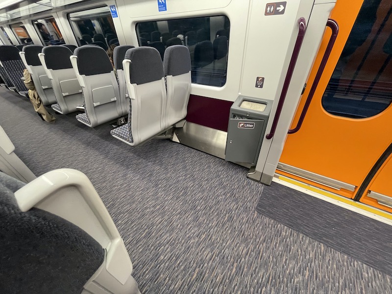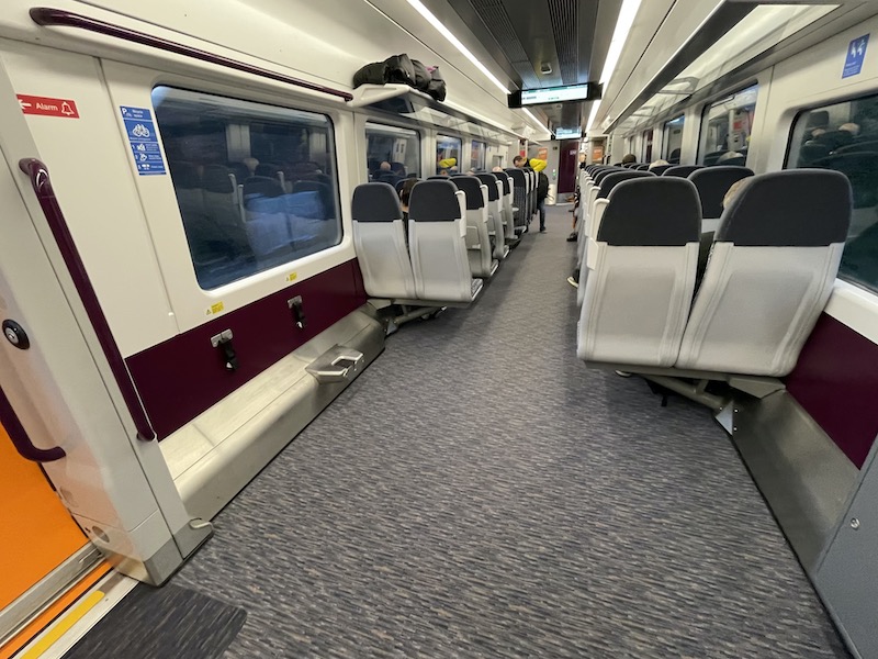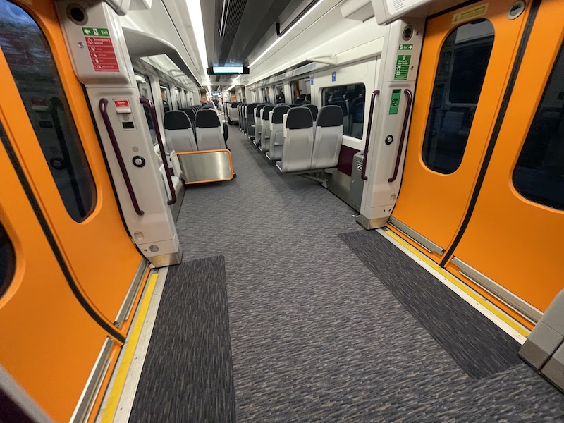 … and what is very noticeable, is the wide open areas by each pair of doors per carriage, something becoming very common on many commuter trains (Greater Anglia please note – no fold down seats blocking the entrance/exit doors).