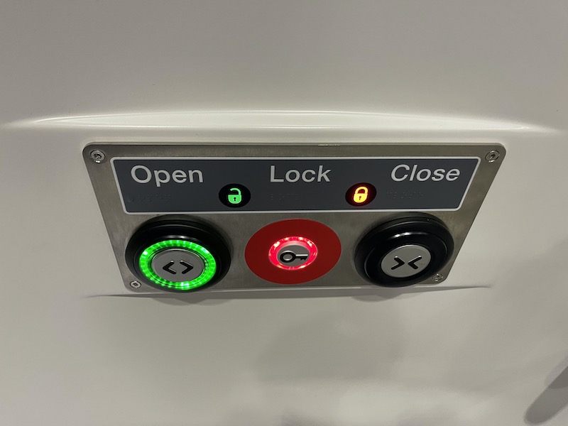 There’s only the one toilet on board each three carriage set but obviously that means two, if running as a six carriage train. The door locking mechanism is clearly marked with a button which lights up red when locked, rather than a switch…