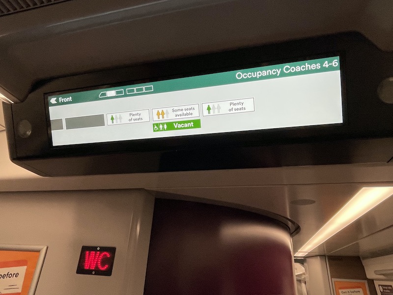 In principle it ought to be a very useful indicator, but I cannot understand the difference between the upper and lower images. Are we travelling in the front 3 carriages, or the back 3 ? The two diagrams don’t tally.