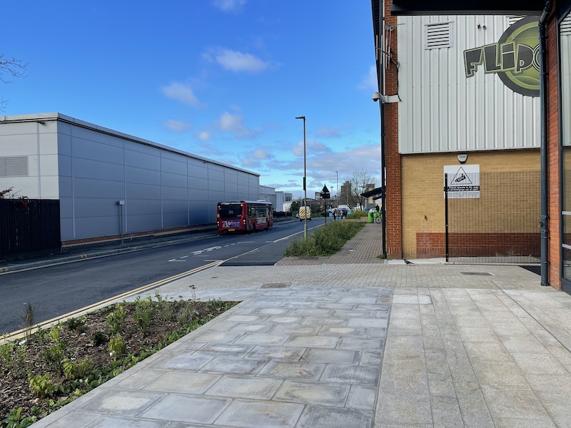 Firstly the photograph showing the bus shelter alongside the zig zag crossing approach markings – why do this? Having a virtually blank canvas it should be possible to place bus stops and shelters in better locations.