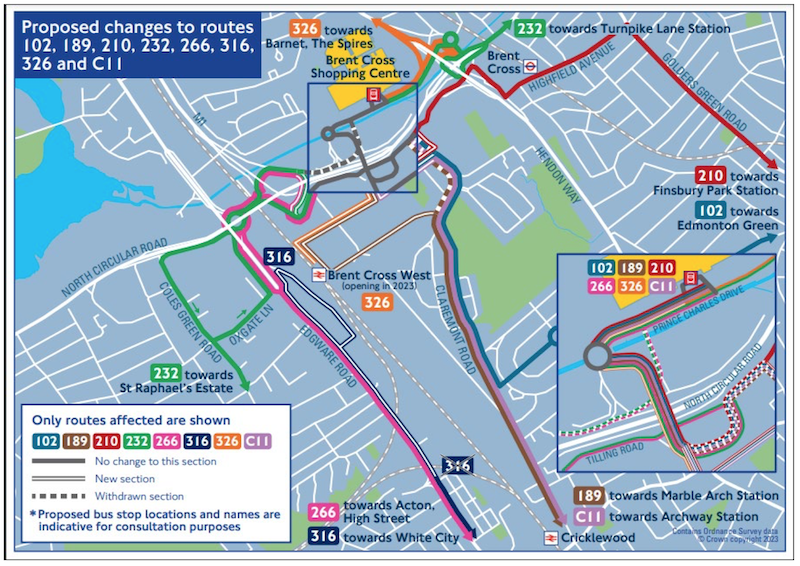 The plan is to extend route 326 from its current terminal point at the Brent Cross shopping centre on the north side of the North Circular Road as well as divert route 189 on its way from Claremont Road to the shopping centre so it serves the new station.