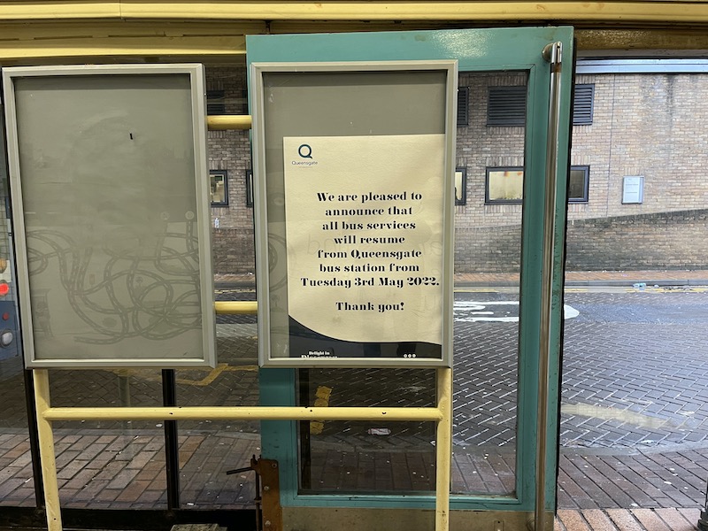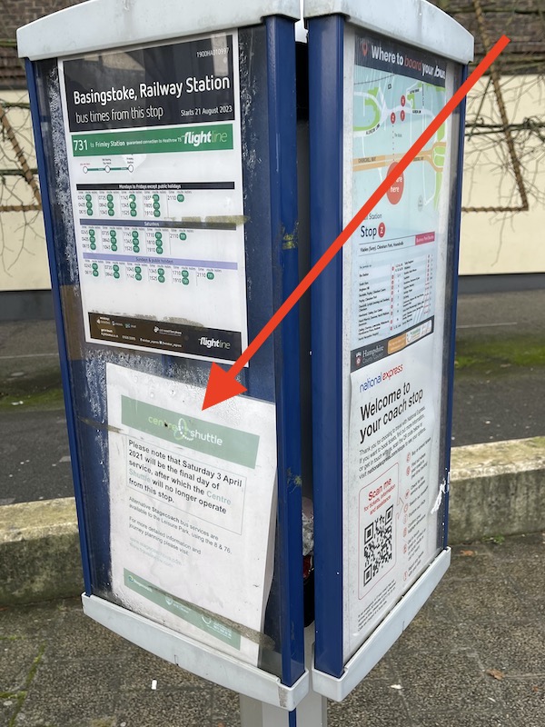 If this notice on display at Basingstoke bus station Stop Z is still there in four months time, it’ll be celebrating being three years out of date. I think we should throw a party.