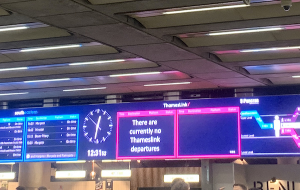 But at St Pancras, it’s completely the opposite with misleading information resulting in what I know in one case led to a passenger seeing the shutters down to the normal platforms A and B used by Thameslink underneath the station (see above) and then looking at the bright new departure boards at just after 12:30 and seeing the message “There are currently no Thameslink departures” (see below) gave up and went home.