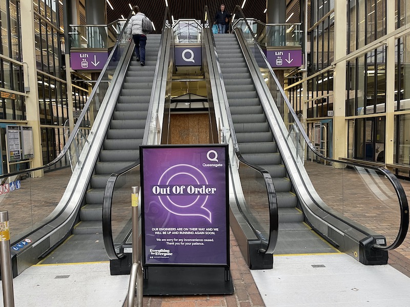 Whenever I visit Peterborough’s Queensgate bus station I’m always struck by the huge contrast in ambiance between the bus station itself and the adjacent shopping centre. The former is definitely the poor relation. Even the adjacent multi storey car park gives a sense of superiority over the bus station. I might be very unlucky, but whenever I visit, one of the escalators is out of action (above) and this time, containers were out to collect rain coming in from the roof…