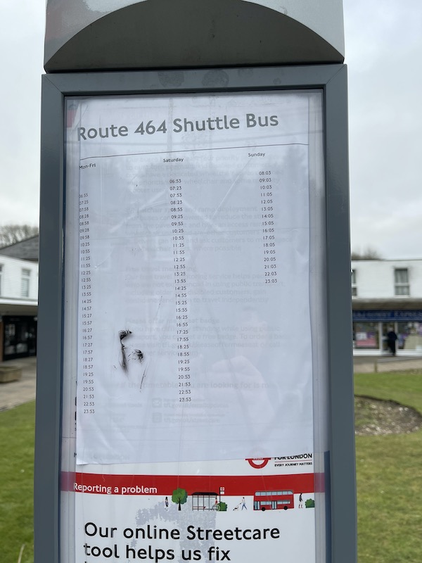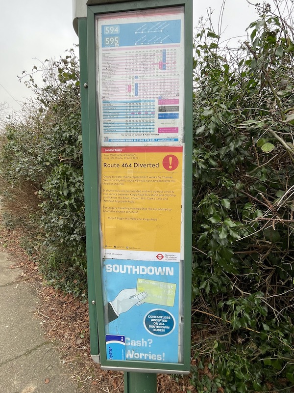 I understand around 100 passenger journeys are being made on a weekday on the 464 Connector which, thanks to Thames Water’s generosity (!), works out at a subsidy of around £9 per journey, but the 464 timetable urgently needs sorting.