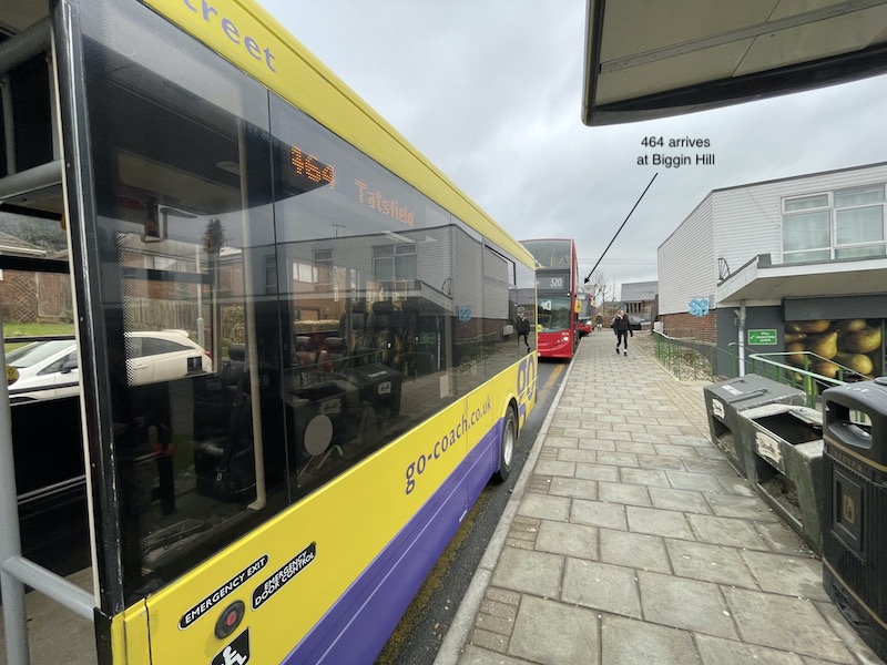 What needs to happen to make this arrangement work is to transfer five minutes layover from New Addington down to Biggin Hill. TfL might well say, leaving New Addington five minutes ahead of the usual scheduled time will inconvenience passengers. But that’s what’s happening at the Tatsfield end of the route where the 464 Connector leaves at 05 and 35 instead of 10 and 40. Transport UK (formerly known as Abellio) might say the 464 drivers need a toilet stop in New Addington, but five minutes should be enough for that and the poor Go Coach drivers don’t even get that at Tatsfield. (There’s nowhere ‘to go’ in Biggin Hill where the buses wait.)