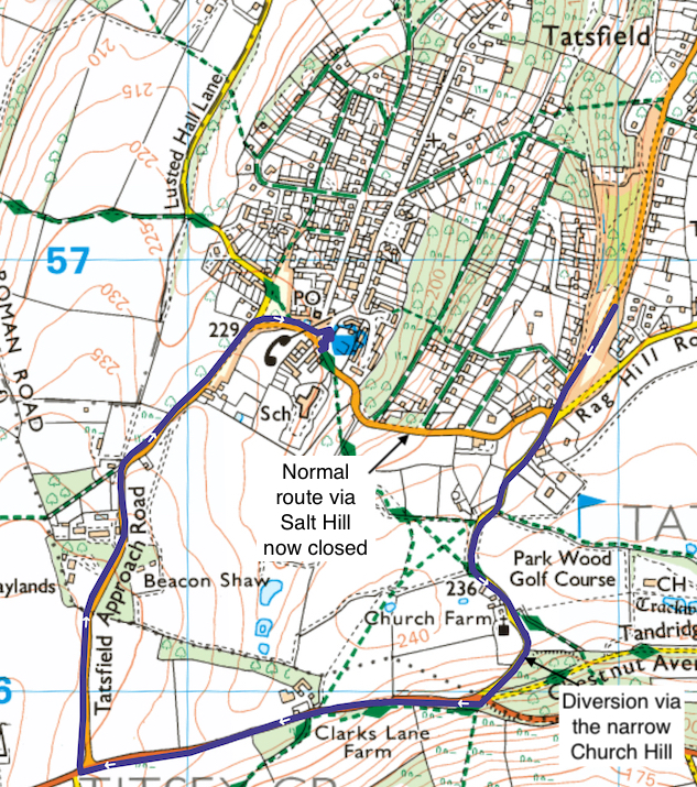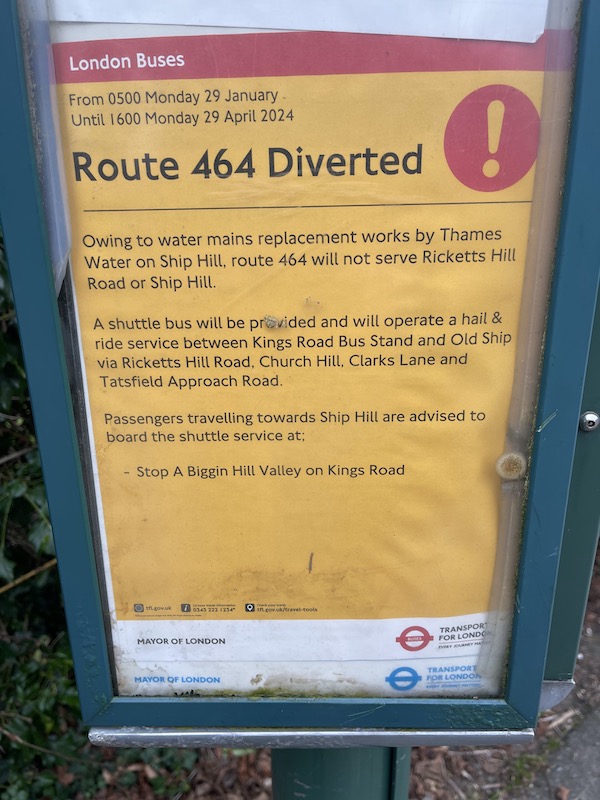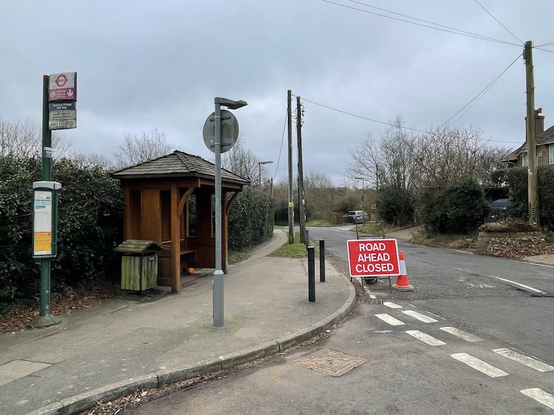 Following nine water main bursts in the last 18 months, Thames Water are replacing the offending main in Ship Hill which leads to the village of Tatsfield. This has meant a road closure preventing buses on route 464 reaching the terminus in the village located south of Biggin Hill, but just over the Greater London boundary in Surrey.