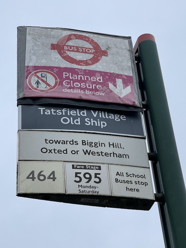 This replicates the normal frequency and span of day for route 464 between Tatsfield and New Addington. It’s not bad for a village with a population of 1,816 residents which isn’t even in London, but obviously has a close affinity with it, being literally just over the border.