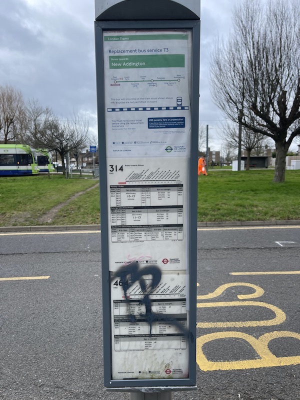 And while in New Addington, maybe TfL should put up some information about the diversion and arrangements at that end of the route too? At the moment there’s nothing. Just a graffiti attacked timetable case.