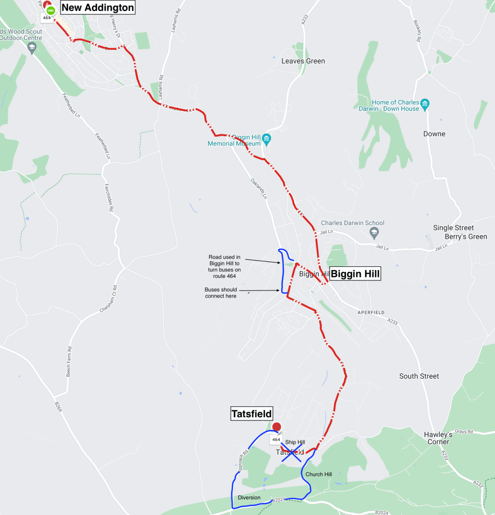 Instead a separate 464 Connector route is providing a shuttle service connecting Biggin Hill where the 464 now ends …