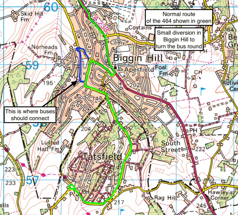 … it doesn’t give enough time for the 464 Connector bus to connect, head off to Tatsfield on the diversion, turn at Tatsfield, retrace the diversion back to Biggin Hill and connect with the same bus on the 464 which has been laying over all that time.