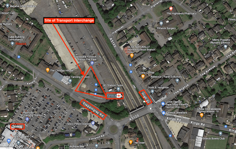 Flitwick has always suffered from the railway line splitting the town centre in two with High Street north of the tracks and the entrance to the station, Tesco and other retail outlets south. The 2017 project envisaged new retail, housing, a Public Transport Interchange and additional car parking with “a major national retailer” on board all being constructed south of the tracks on the acquired land and rejigging the Network Rail/GTR station car park.