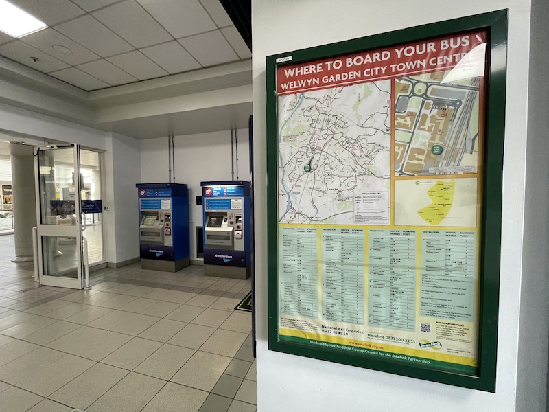 Welwyn Garden City isn’t the only station accessible via a shopping centre, but I can’t think of another one outside of Merseyside where the ticket office is located along with the retail units, as seen above in the town’s Howard Centre, together with Ticket Vending machines and well out-of-date Where To Board Your Bus poster – probably because everyone’s forgotten it’s there.