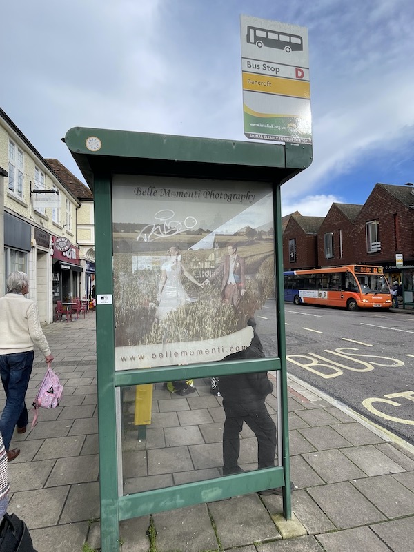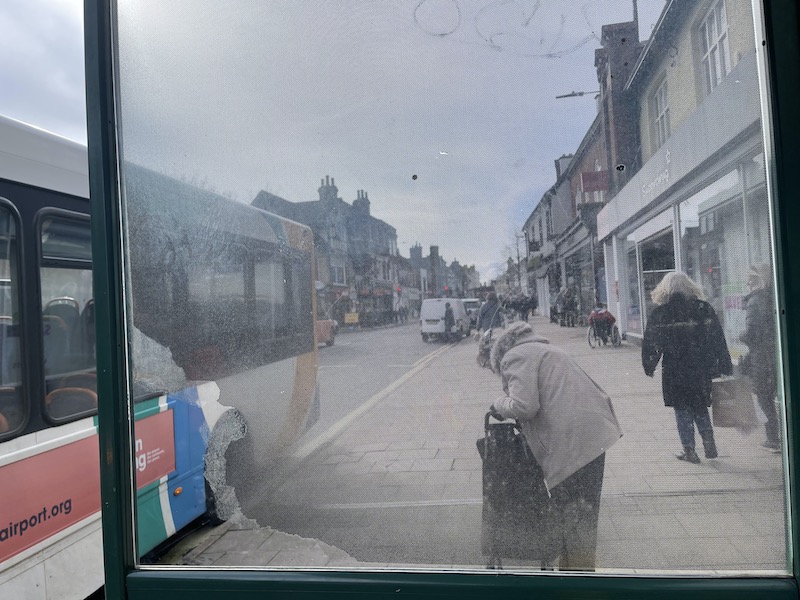 Readers will know my dislike of so called ‘contravision’ (other makes are just as bad) on bus windows. While in Hitchin the other day I came across the remnants of a contavision advert on the end of a bus shelter – the very place you want to be able to see clearly through to check what bus is coming. People who authorise this stuff must never wait for a bus, otherwise they wouldn’t do it. Some bus destination screens are bad enough to read even in the best clear light.