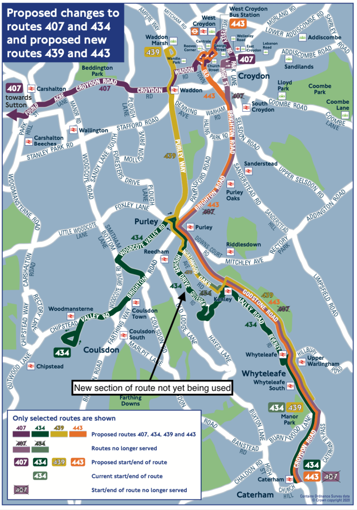 Route 434 is instead using Godstone Road along with the 407 (which as explained earlier continues to run) as shown on the updated map below, so is adding unnecessary mileage duplicating an existing route, as well as being extended from Whyteleafe Wapses Lodge Roundabout to Caterham.