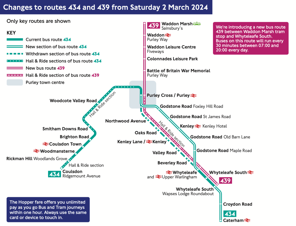 One of the two new routes introduced yesterday – numbered 439 – is also shown on the above map which connects Waddon Marsh with Purley and then takes over the former 434 routing as far as Whyteleafe Wapses Lodge Roundabout.