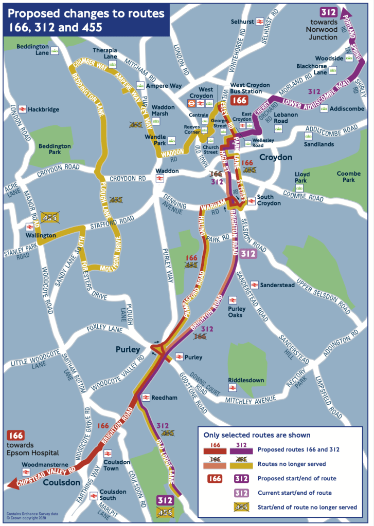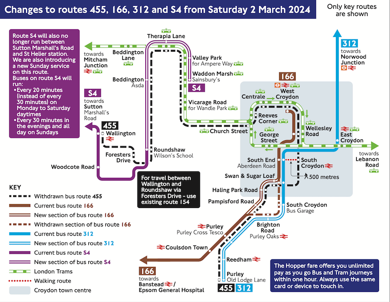 In essence the purple S4 has been extended beyond Roundshaw to Waddon Marsh; the brown 166 is diverted on its way to Purley Cross Tesco from the parallel Brighton Road and the blue 312 is extended beyond South Croydon bus garage to Purley Old Lodge Lane.