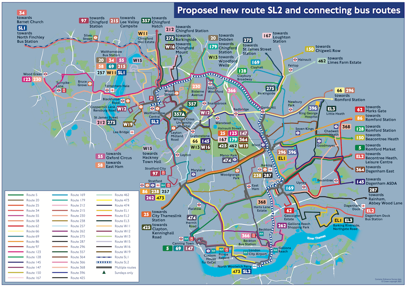 It’s another significant uplift in resources – a Peak Vehicle Requirement of 16 vehicles – alongside no compensating reductions in parallel routes adding significantly to the network provision especially on the busy corridor between Gants Hill, Ilford and Barking, the former of which is served by a multitude of bus routes while the latter sees the high profile East London Transit branded EL1 – which was once the future – and the 169. (I can’t help wondering what passengers will make of an EL2 and SL2 in Barking.)