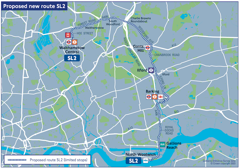 West of Gants Hill the SL2 duplicates the 123 from soon after it leaves its Walthamstow Central bus station terminus (along Forest Road and Woodford Avenue) via Gants Hill to Ilford while after Barking it parallels the 366 via Gallions Reach and then makes its way via route 474 to terminate at the North Woolwich Free Ferry crossing.