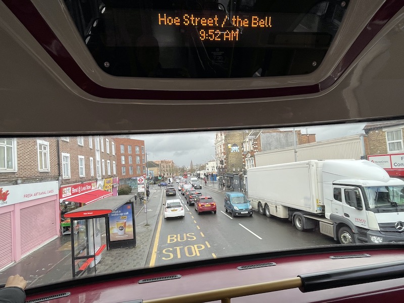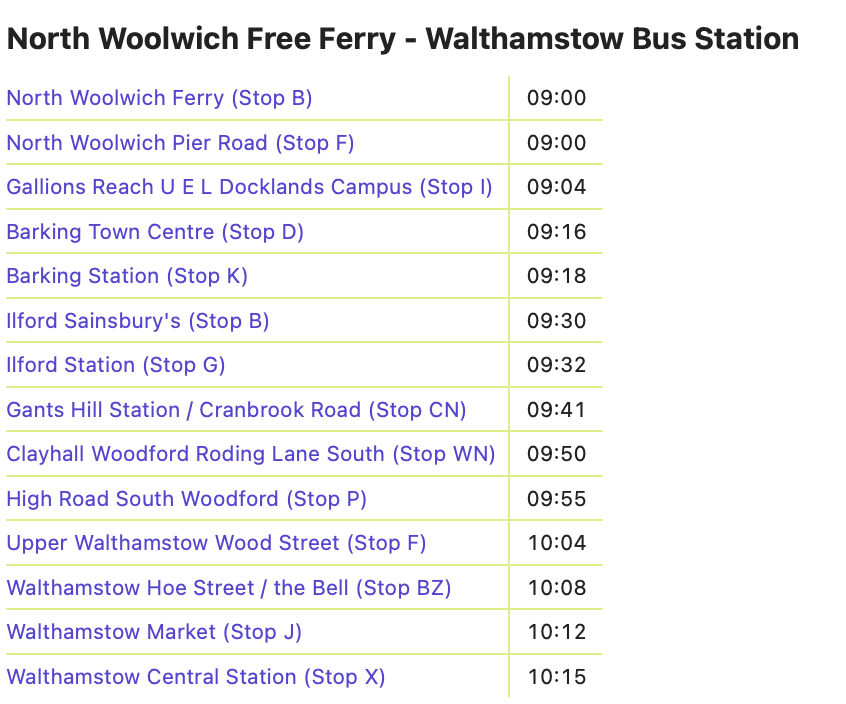 Re timing, the SL2 yesterday (March 9, 2024) took 82 minutes to get from Walthamstow Central to Barking, due to a colossal jam (due to roadworks on, and the narrowness of, Ilford Lane, plus just an overload of traffic). It then abruptly terminated in Barking — the classic double jeopardy of a delayed bus; let’s screw passengers twice over — with our driver promising the next one would continue to North Woolwich. The next one… terminated in Barking. As then did the next one. By now there was a mob of passengers. I decided to take an Uber, and eventually arrived at North Woolwich ferry terminal at 2.39pm, some 109 minutes after leaving Walthamstow.