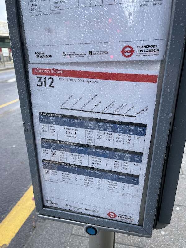 Again, I understand buses on the 312 were deployed on another route (the 325 in East London) until Friday night but whatever happened to staff working overnight to ensure things like this were attended to? Such appalling presentation would never have happened in the old London Transport days.