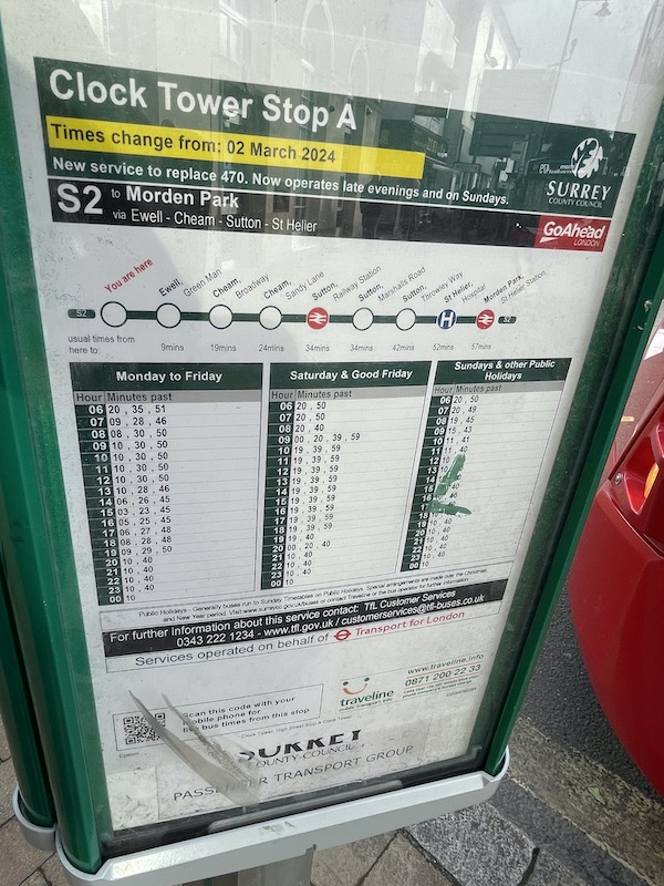 It was good to see Surrey County Council had installed updated timetables at bus stops in Epsom for the S2…
