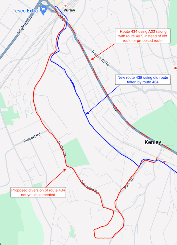 There was a proposal to divert route 434 south of Purley to serve bus devoid roads between Purley and Whyteleafe (Higher Drive and Cullesden Road) where new residential development is underway as shown on the map in the 2020 consultation (below).